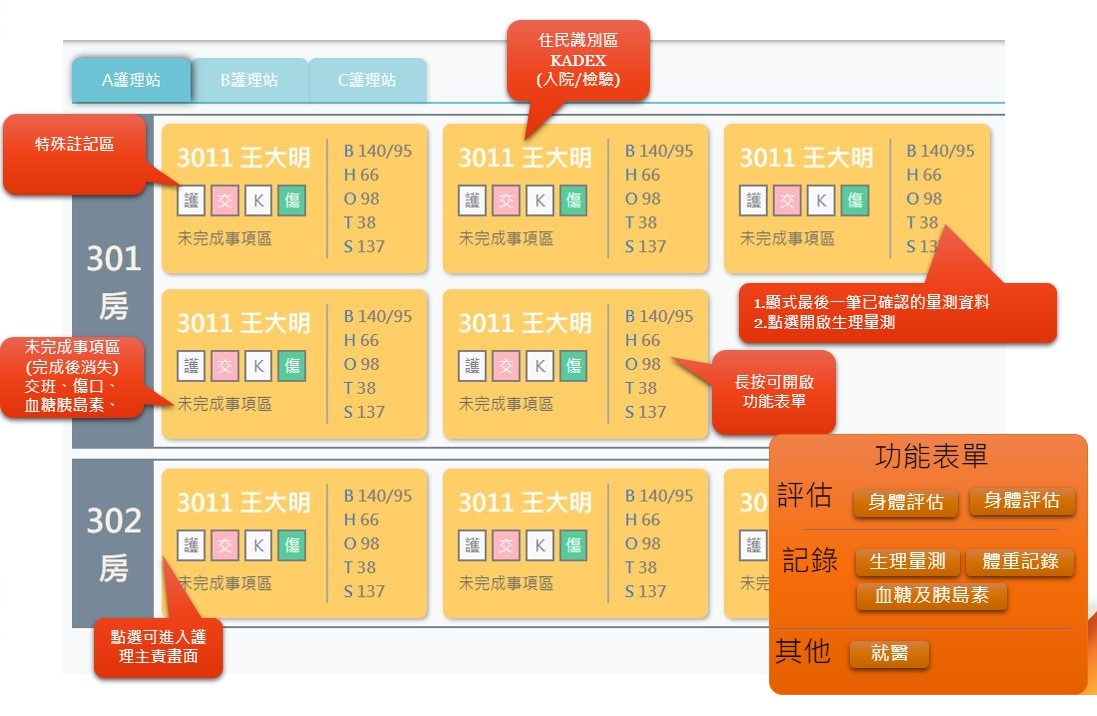 護理人員依不同情境透過web或app快速查閱、輸入,減少紙本抄寫,把時間用在照護個案上。