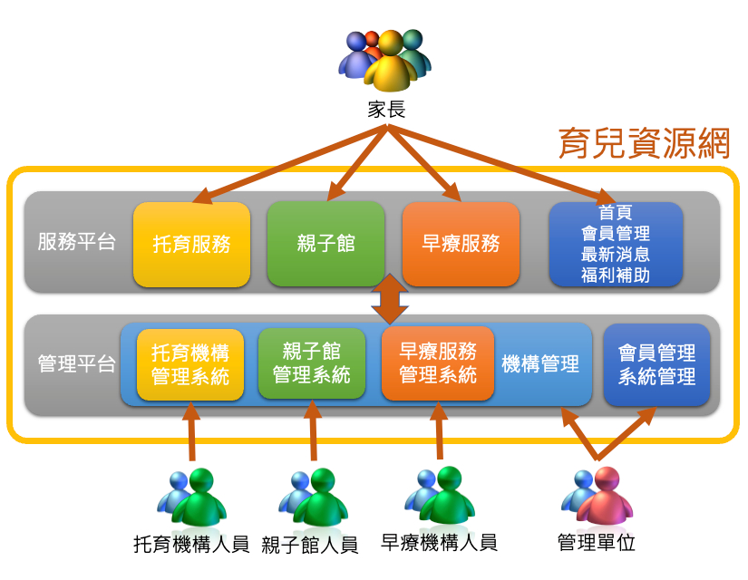 育兒資訊網:單一入口、化繁為簡,所有跟育兒相關的資訊可以在同一個資訊網內全部都找得到。特色功能包含:育兒資源地圖式查詢、線上報名、圖像化資料庫、個別機構特色化首頁、及行動APP。